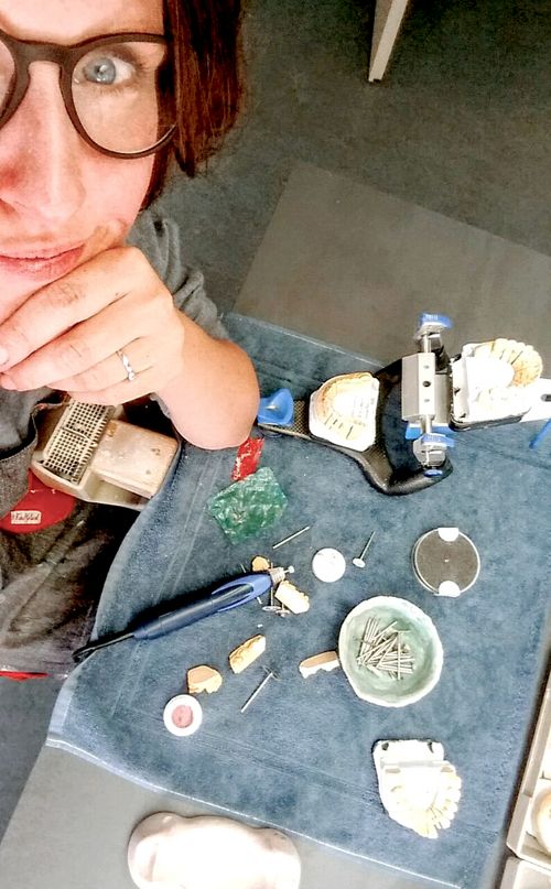 Diese Frage stellt sich auch Peggy Ohmke als sie im Juli 2017 ein Stellenangebot von Regionalberaterin Henriette Freikamp bei Rojahn Zahntechnik bekommt. Die Magdeburgerin hat eine Ausbildung als Zahntechnikerin erfolgreich im Jahr 2000 abgeschlossen und arbeitet bis 2005 auch im erlernten Beruf. Nach vier Jahren Elternzeit entscheidet sie sich, einen anderen Weg einzuschlagen. „Ich war schon immer kreativ. Ich nähe und male gern“, erklärt die zweifache Mama ihren damaligen Entschluss, sich 2009 mit ihrem Label FarbGlück für selbstgenähte Einzelstücke selbstständig zu machen. Doch Selbstständigkeit bedeutet auch ein Stück Unsicherheit. Als Alleinerziehende ist das nicht immer einfach. Aus diesem Grund arbeitet sie ab Sommer 2016 in einer Schmuckwerkstatt. „Die Arbeit hat mir viel Spaß gemacht. Da ich aber auch Schmuckkurse betreute, die am Abend oder am Wochenende stattfanden, wollte ich einen Job finden, mit dem ich Beruf und Familie in Einklang bringen kann“, so Peggy Ohmke.