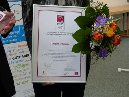 Am 28. Februar wurde Koegel der Friseur in der Handwerkskammer Halle als „Bester Arbeitgeber Sachsen-Anhalt“ ausgezeichnet. Vorausgegangen war ein Kultur Audit und eine Mitarbeiterbefragung des Institutes Great Place to Work®. Das hallesche Unternehmen überzeugte durch die Ergebnisse der Mitarbeiterbefragung und die aktiven Personalmaßnahmen zur Stärkung der Unternehmenskultur. "Koegel der Friseur steht für Tradition wie für Innovation, Loyalität und Herzlichkeit wie für Sicherheit, Klarheit und Offenheit", urteilt das Institut Great Place to Work®. Hier sind die Mitarbeitenden genauso wichtig wie die Kund*innen und Partner. Aus diesem Grund bietet das Unternehmen seinen Mitarbeiter*innen nicht nur einen fairen Lohn, sondern unterstützt die persönliche Weiterentwicklung durch Coachinggespräche und Seminarreihen. Aber auch die Gesundheitsprävention der Mitarbeiter*innen ist bei Koegel der Friseur ein zentraler Baustein der Unternehmenskultur. Meditationsübungen zur Entspannung sind in den Arbeitsalltag integriert. Neben Weiterbildung und Gesundheit setzt das Unternehmen auch auf neue Wege der Kommunikation und hat eine eigene App für die interne Kommunikation entwickelt. So ist es nicht verwunderlich, dass 94 Prozent der Mitarbeitenden bestätigen: „Die Führungskräfte zeigen aufrichtiges Interesse an mir als Person und nicht nur als Arbeitskraft“. Zufriedene Mitarbeiter*innen schaffen Erfolg. Aktuell ist man bei „TOP Salon – The Challenge 2018“ unter den besten 15 Salons in Deutschland in der Kategorie „Employer“. Auch die Kund*innen wissen das zu schätzen, wie eine Kundenaussage bewertet: „Konzept trifft Kompetenz“.