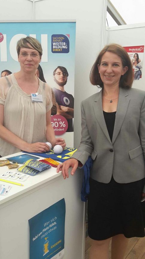 Über 50 Student*innen interessierten sich für unser Leistungsangebot auf der 15. Firmenkontaktmesse der Hochschule Magdeburg-Stendal am 7. Juni. „Die Nachfrage war wirklich groß. Die Student*innen kamen mit vielen Fragen: Wie sieht der regionale Arbeitsmarkt aus? Welche Möglichkeiten bietet er mir nach dem Studium?“, blickt Julia Schuster, Regionalberaterin Magdeburg positiv auf die Messe zurück. Die Student*innen suchten zum einen Tipps für ihre Bewerbungsunterlagen oder zum richtigen Einstieg für ein Praktikum. Es wurden mehrere Beratungstermine vereinbart. Aber auch Aussteller zeigten Interesse und informierten sich zu den Fördermöglichkeiten Sachsen-Anhalt WEITERBILDUNG DIREKT und WEITERBILDUNG BETRIEB. Die Rektorin der Hochschule Magdeburg-Stendal Prof. Dr. Anne Lequy kam ebenfalls zu einem Gespräch mit Regionalberaterin Henriette Freikamp an unseren Stand.